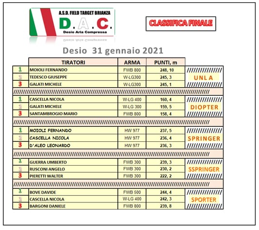 Parliamo di qualcuno dei partecipanti, Michele Galati, ormai un paio di gradini del podio se li è proprio comprati, quello dell’Unlimited “A” (3° posto) e quello della Diottra (2° posto); Fernando Moioli si è distinto, con una prestazione da “categoria Full”, in Unlimited “A” con un bel 248,10 oltre che un bel primo posto in Springer; Giuseppe Tedesco, come sempre costante ed in forma, non ha mancato il suo posto sul podio dell’Unlimited “A”. Ma oggi il vero “esploit “ si è avuto da Nicola Cascella che, con una gran voglia di fare bene, si é distinto per ben tre podi. Secondo posto in Sporter e secondo posto in Springer dove ha costretto il suo da sempre rivale, il leggendario Leonardo D’aleo (nome di battaglia Leo), ad accontentarsi del terzo gradino. Poi, come se i piazzamenti precedenti non gli fossero bastati , è risultato primo in Diottra, con un cartello da primato, 160,04. Un punteggio che era davvero tanto che non si vedeva nelle nostre gare a Desio. Del resto, il nostro Nicola si sta impegnando molto ed i risultati si vedono….