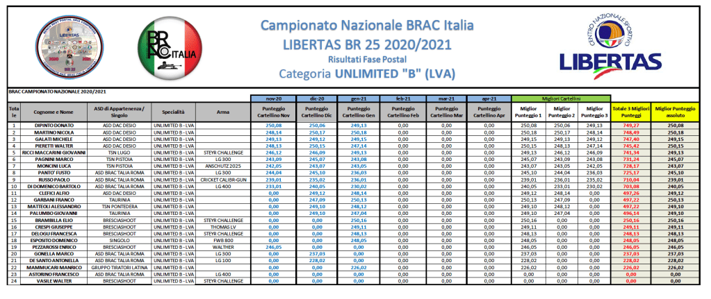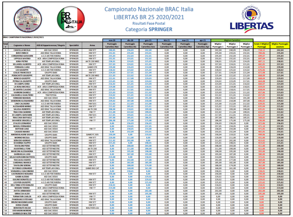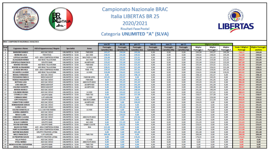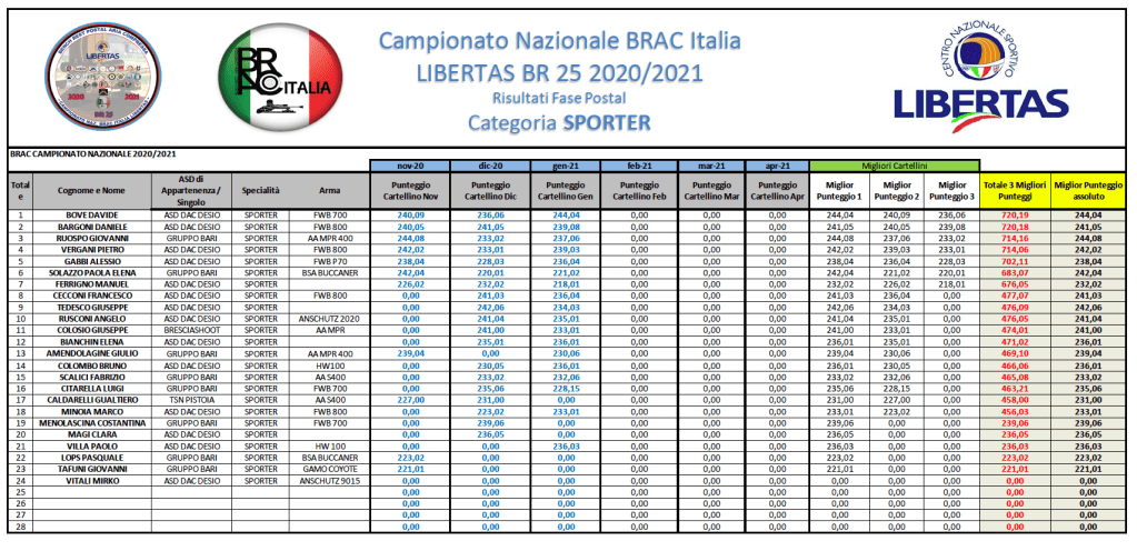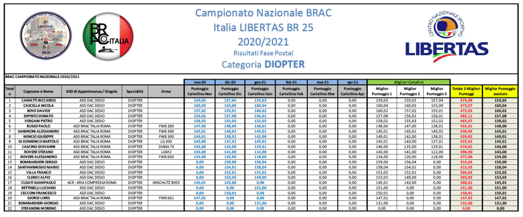 Si riportano di seguito i risultati di GARA 3 che, rammentiamo, sono scaricabili, in formato .PDF dal menù posto sulla SX del vostro schermo alla voce “Campionato Nazionale BR 25 – Stagione 2020/2021”