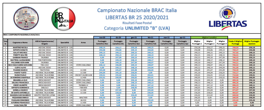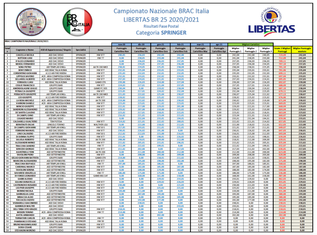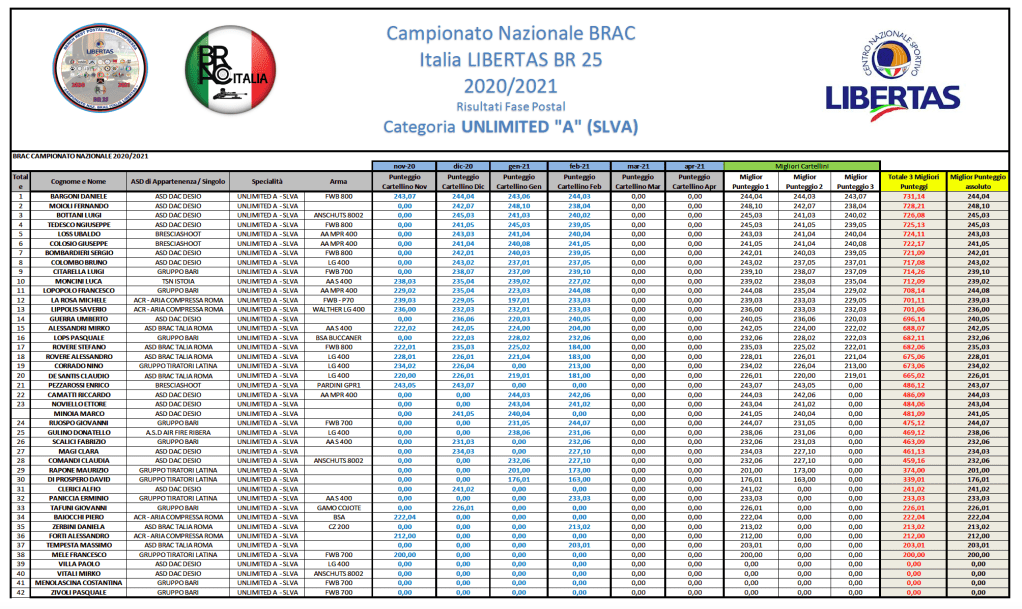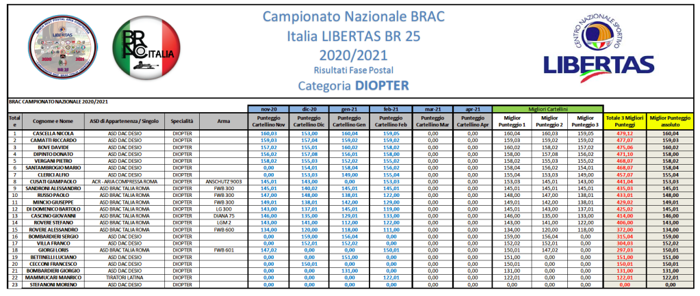 l’EPS Libertas Nazionale, Ente patrocinatore dell’evento, ha messo in cantiere, qualche mese fa, un progetto che ha chiamato “Lo Sport ti cura – La palestra della salute”, all’interno del quale ha trovato collocazione anche il nostro Campionato. Iniziativa che sta restituendo eccellenti risultati, almeno per quanto riguarda noi di BRAC Italia. Benvengano pertanto i nostri momenti di incontro sulle linee di tiro, ottima ed indiscussa terapia antistress ed i punteggi ottenuti ne sono valida riprova…..