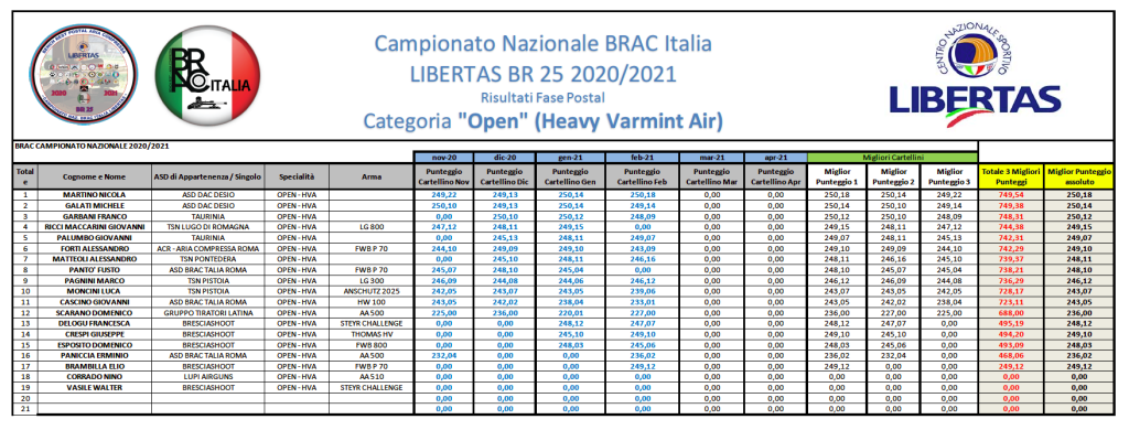Si riportano di seguito i risultati di GARA 4 che, rammentiamo, sono scaricabili, in formato .PDF dal menù posto sulla SX del vostro schermo alla voce “Campionato Nazionale BR 25 – Stagione 2020/2021”
