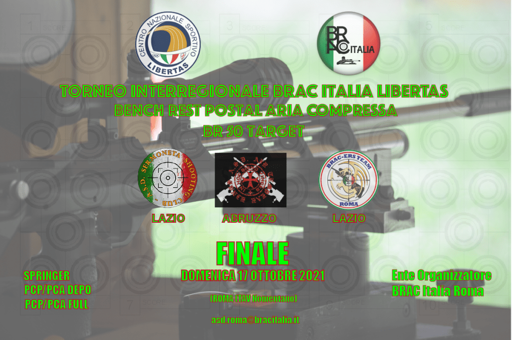 LA FINALE DEL TORNEO BRAC ITALIA LIBERTAS DI BR 50 TARGET SI SVOLGERA’ DOMENICA 17 OTTOBRE 2021 PRESSO IL CAMPO DI TIRO ISTITUZIONALE DI ROMA DELL’ ASD BRAC ITALIA.