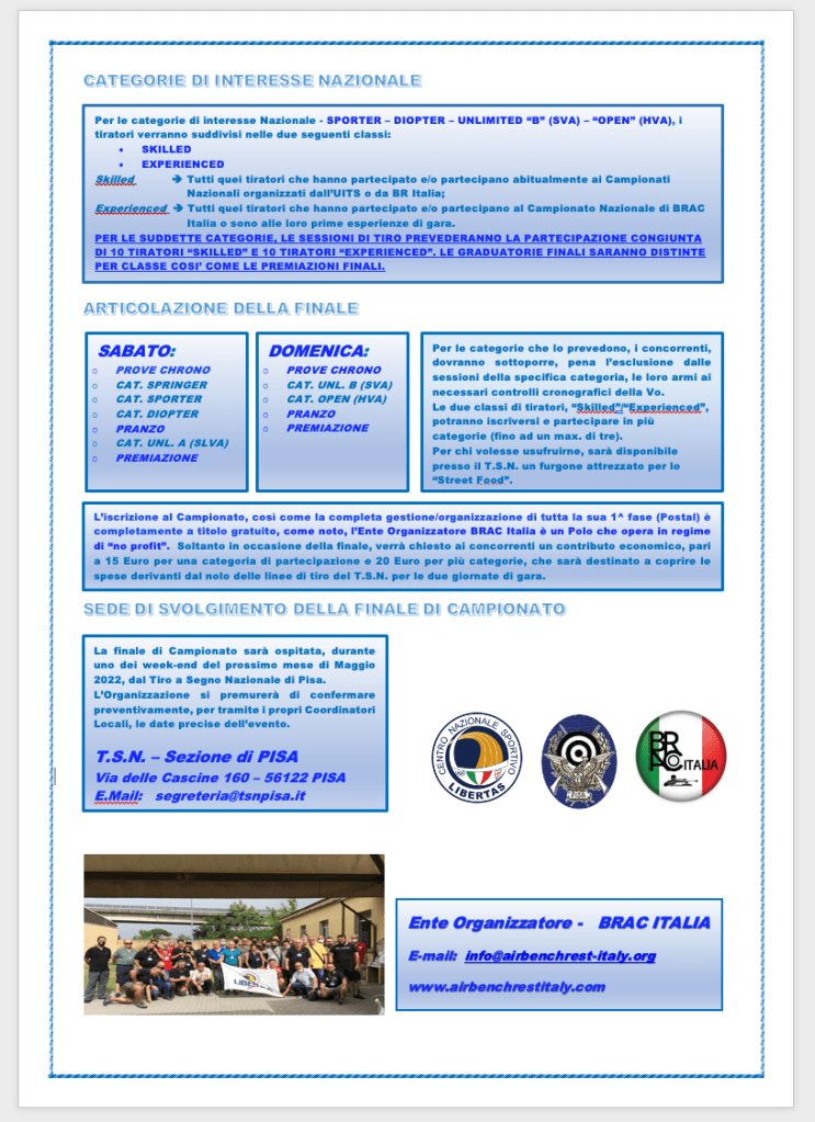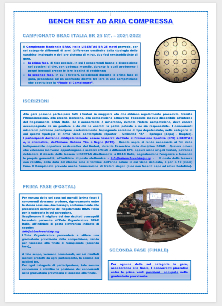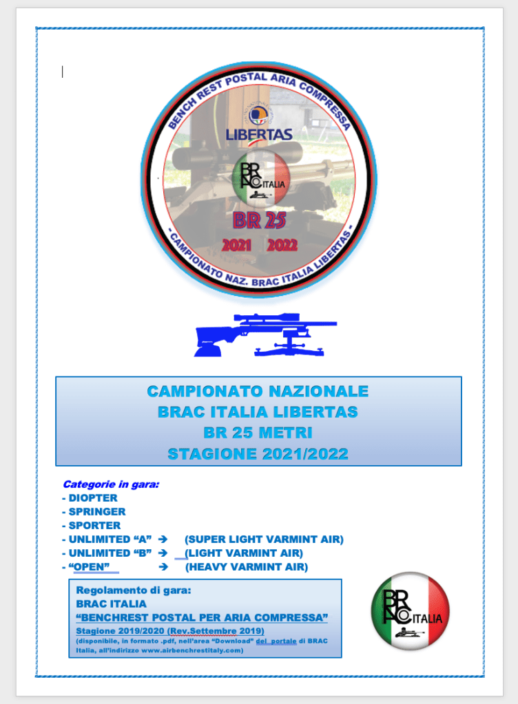 Si prega chi volesse partecipare di prendere bene visione del documento che precede e del Regolamento BENCHREST POSTAL PER ARIA COMPRESSA – Stagione 2019/2020 (Rev.1) scaricabile dall’area “download” del presente portale.