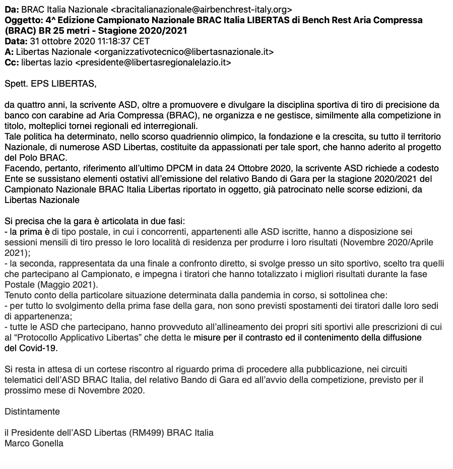 Si sottolinea che se, in base ai dettami dell’ultimo DPCM del 24 Ottobre 2020, si riuscisse a far decollare il Campionato Nazionale BRAC Italia LIBERTAS di BR 25 per la stagione 2020/2021, le prescrizioni contenute nei citati documenti e l’allineamento operativo dei siti sportivi in base ai dettami in essi contenuti, saranno elemento indispensabile ai fini dell’iscrizione dei sodalizi alla competizione.