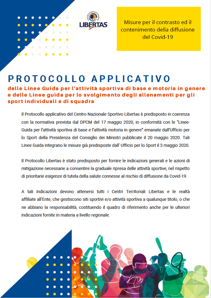 Il Protocollo Libertas (Allegato 1) è stato predisposto per fornire le indicazioni generali e le azioni di mitigazione necessarie per la ripresa delle attività sportive, nel rispetto di prioritarie esigenze di tutela della salute connesse al rischio di diffusione da Covid-19. I suoi contenuti sono in coerenza con la normativa prevista dal DPCM dello scorso 17 maggio 2020 ed in conformità con le “Linee-Guida per l’attività sportiva di base e l’attività motoria in genere” emanate dall’Ufficio per lo Sport della Presidenza del Consiglio dei Ministri pubblicate il 20 maggio 2020