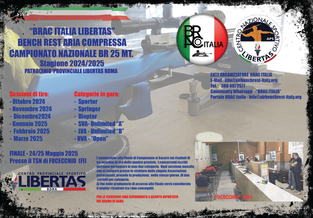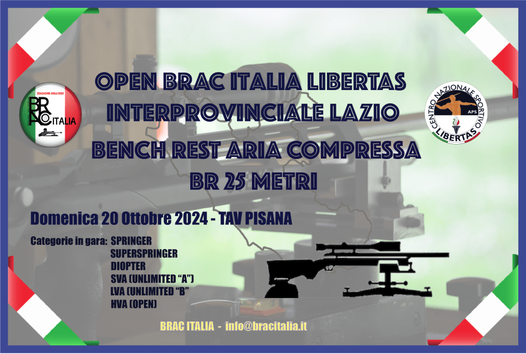 l’ASD BRAC Italia, in coordinamento con Libertas Provincia Roma, organizza, per il 20 Ottobre 2024 presso il Campo di tiro del TAV Pisana, un torneo aperto a tutte le provincie del Lazio.