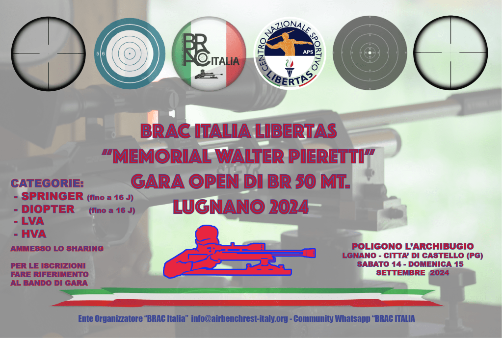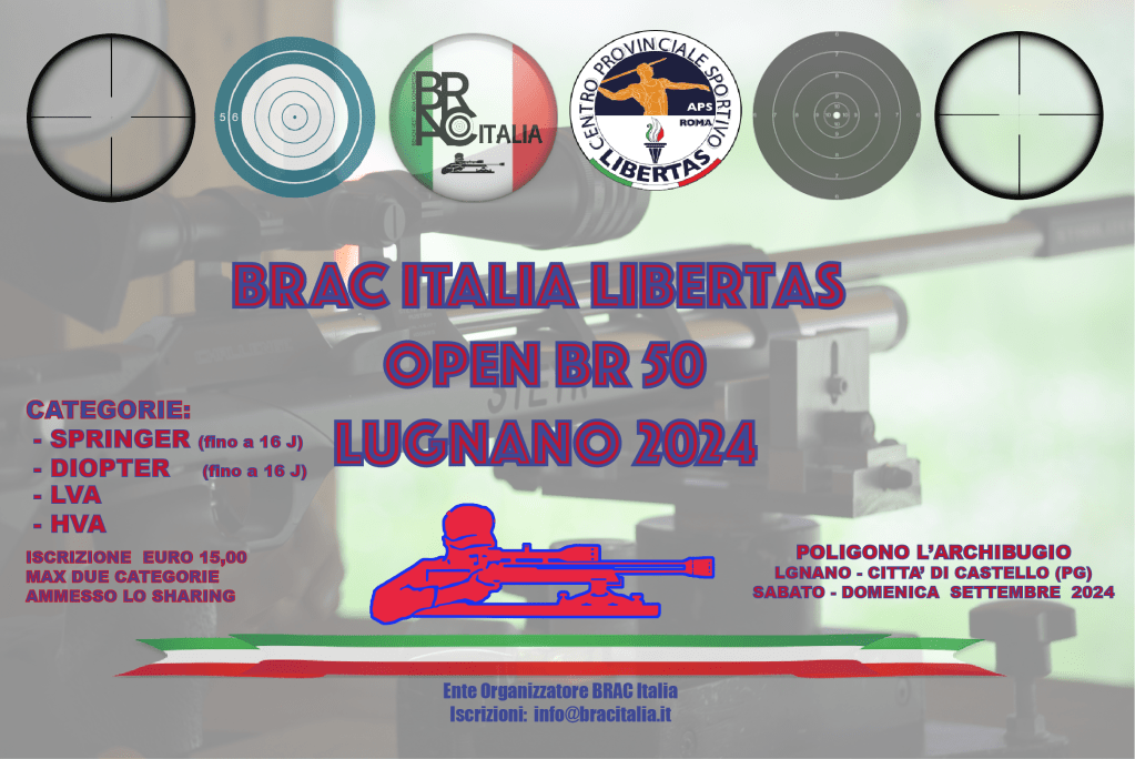 Sperando di fare cosa gradita a tutti gli appassionati di tiro con l’aria compressa che seguono le gare organizzate da BRAC Italia, la nuova stagione di tiro inizierà con una competizione “Open”, curata dal Polo BRAC presso Lugnano [Città di castello(PG)]. Il week end del prossimo Settembre in cui verrà organizzato l’evento, verrà reso noto non appena possibile.