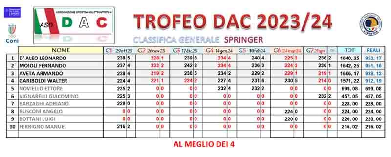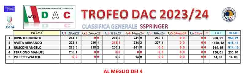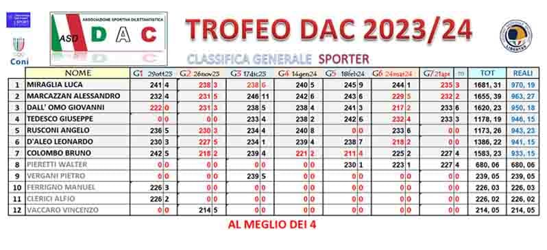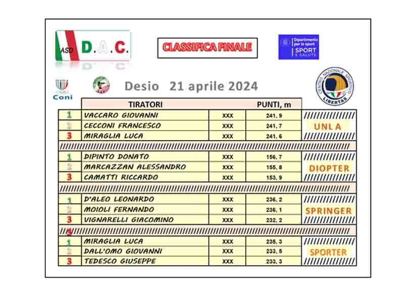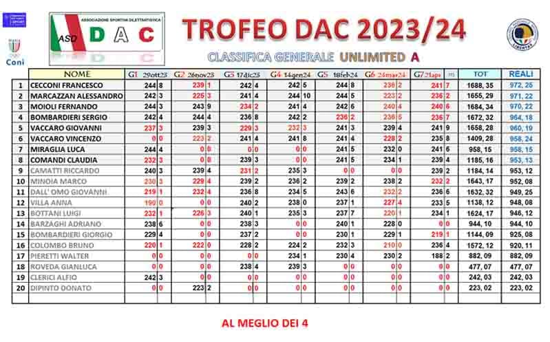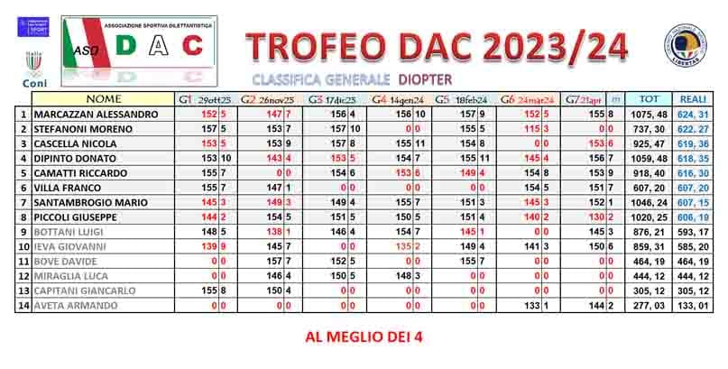 Si è svolta oggi 21 aprile 2024 a Desio (MB), la 7° ed ultima prova del campionato DAC in una giornata dal clima non proprio primaverile. Vento moderato e luce di media intensità per via del cielo non particolarmente terso. I partecipanti sono stati meno del previsto a causa di qualche assenza per malattia e impegni   inderogabili. Approfittando della presenza della maggioranza dei soci i turni di gara sono stati inoltre interrotti verso le 11,00 per dare spazio alla solita assemblea annuale con approvazione bilanci, al termine della quale la sfida domenicale è ripartita. In allegato le foto dei podi, le classifiche della giornata e quelle generali di fine campionato. L’appuntamento a questo punto è per la gara finale che di terrà in data 26 maggio.