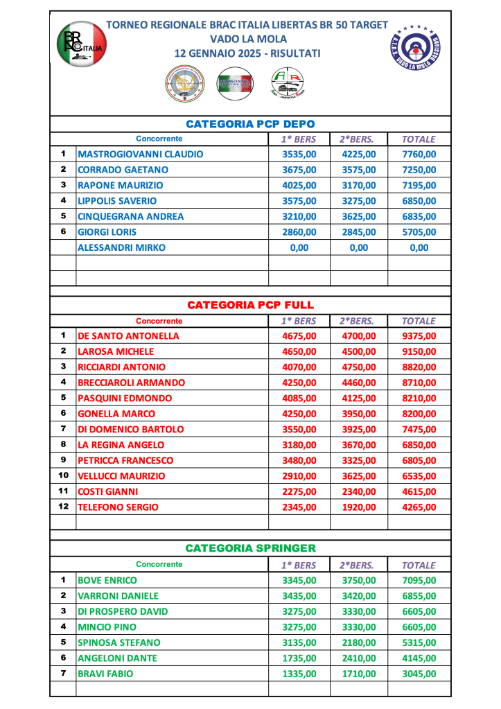 BR 50 TARGET – VADO LA MOLA – 12 GENNAIO 2024 Dim seguito i risultati della gara BRAC BR50 Target tenutasi a vado La Mola Domenica 12 Gennaio 2025: Open Vado La Mola BR 50 Target – RISULTATIDownload Condividi: Condividi su X (Si apre in una nuova finestra) X Condividi su Facebook (Si apre in una nuova finestra) Facebook Mi piace Caricamento...