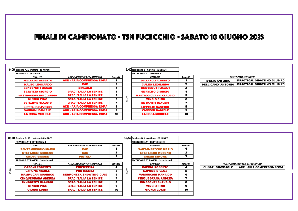 Le molteplici defezioni da parte di molti finalisti verificatesi all’atto della loro adesione all’evento conclusivo del Campionato, ha necessariamente implicato una revisione delle grigie originarie che prevedevano un impegno del poligono di due giornate.