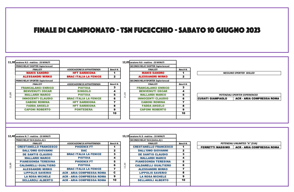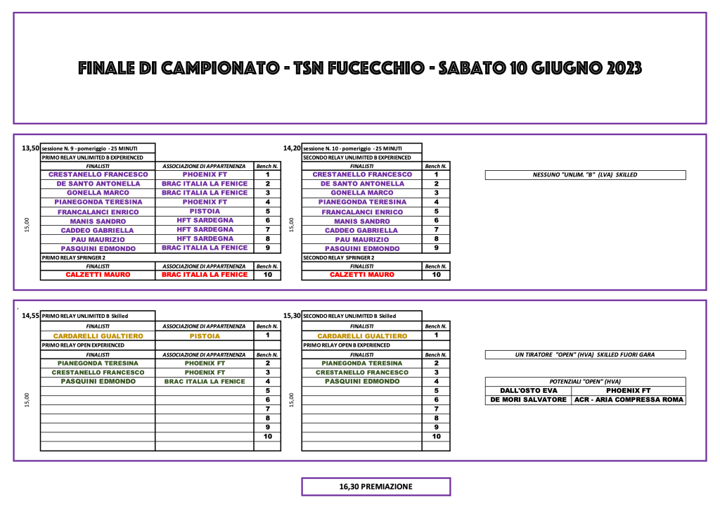 Rivisitando le posizioni dei concorrenti che invece hanno dato la loro disponibilità a partecipare, dimostrando impegno personale, passione e serietà, si è riusciti a comprimere i tempi di gara accorpando tutte le categorie impegnate nella finale in un unico giorno che è stato stabilito, di concerto con i partecipanti, per il prossimo Sabato 10 Giugno.