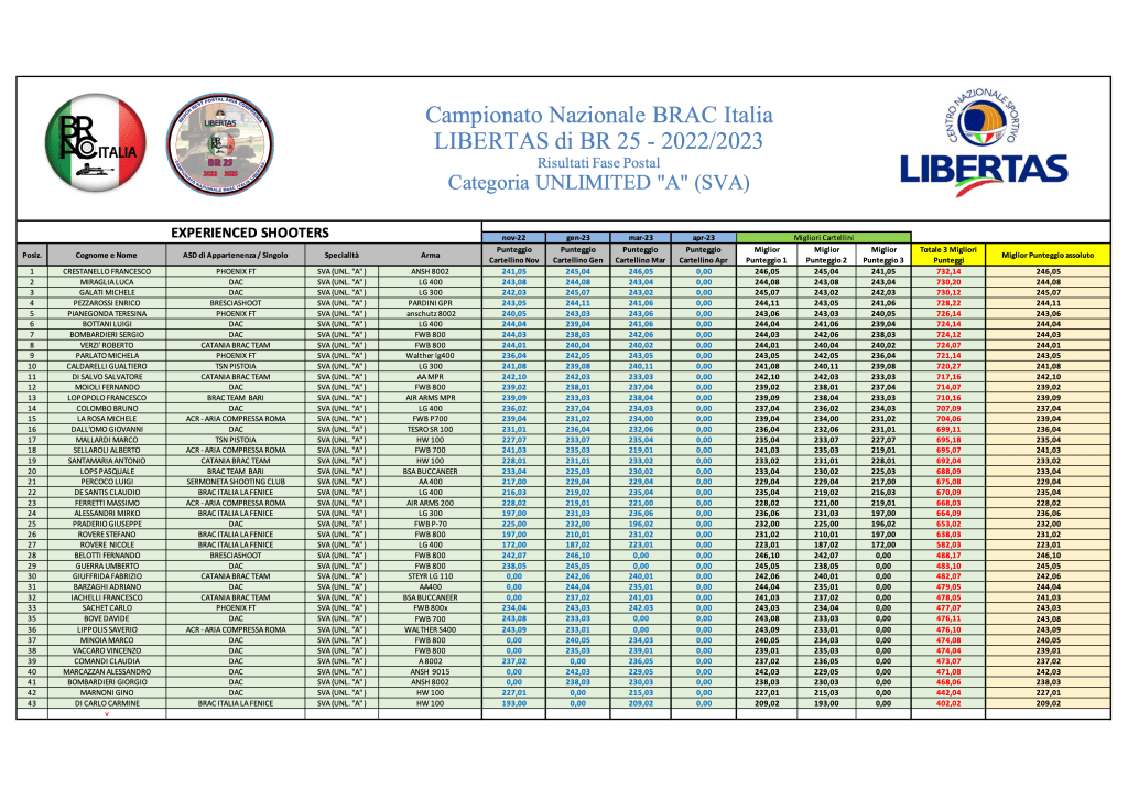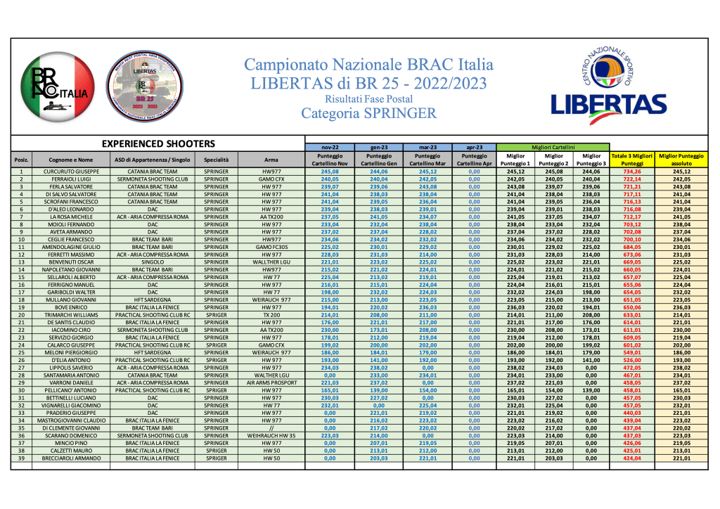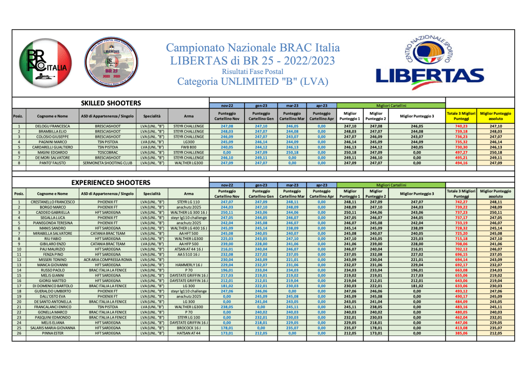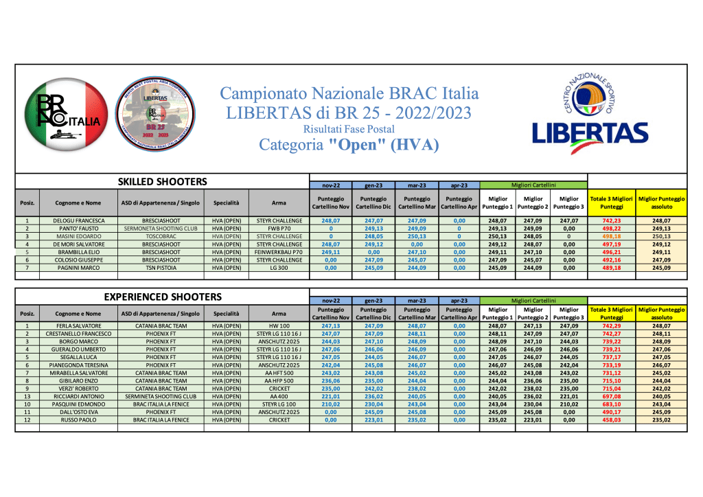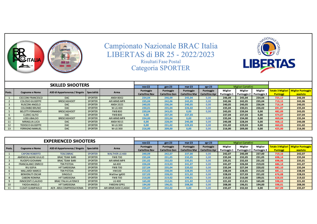 Di seguito le graduatorie provvisorie del campionato Nazionale BRAC Italia Libertas di BR 25 – Stagione 2022/2023.
